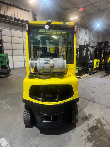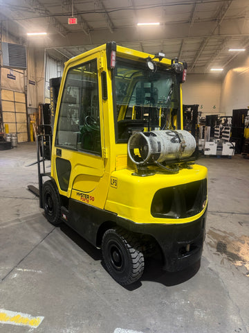 2021 HYSTER H50FT 5000 LB LP GAS FORKLIFT PNEUMATIC 86/189" 3 STAGE MAST SIDE SHIFTING FORK POSITIONER ENCLOSED CAB with HEAT 984 HOURS STOCK # BF9113729-BUF